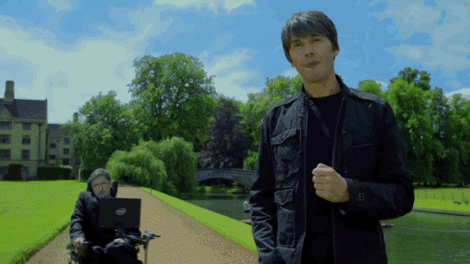 It comes from the Monty Python live show, where Brian Cox showed up to nitpick the song for scientific accuracy, before Hawking knocks him over to take center stage. And to fly off into space. You could spend forever making gifs of this: